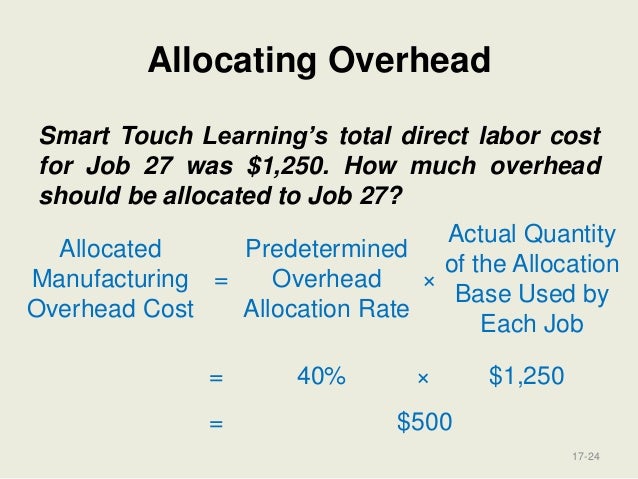 Generally this is the labor hours or machine hours but it could be another method that the business thinks best. Here is the formula for calculating your monthly manufacturing overhead rate. Cost pool Total activity measure Overhead allocation per unit.