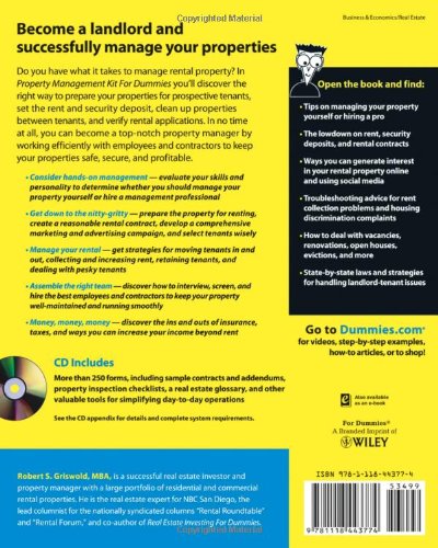 Property Management KitFor Dummies gives you proven strategies for establishing andmaintaining rental properties whether a single family ormulti-resident unit. If your property is not yet purchased or in rentable condition these are the two things that you need to work on first. Griswold MBA and published in April of 2001 is highly touted as a complete reference for property managers.